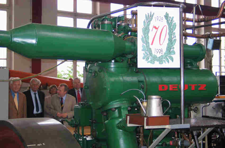 In der Maschinenhalle sahen die Jubilare den (immer noch betriebsbereiten und in der Ausbildung eingesetzten) Deutz-Motor von 1928, den sie noch aus ihrer Studienzeit kannten (weitere Bilder): |