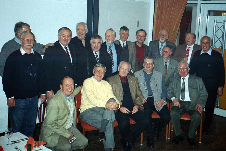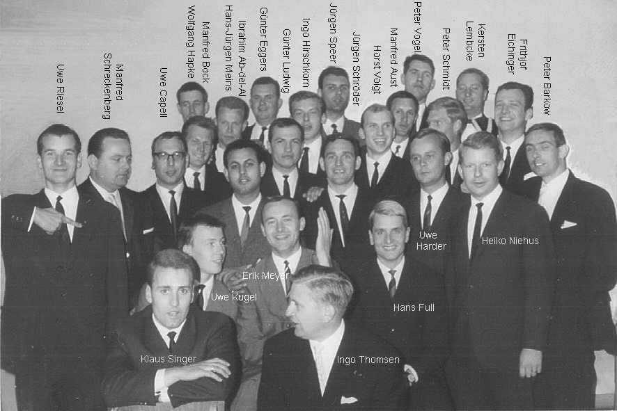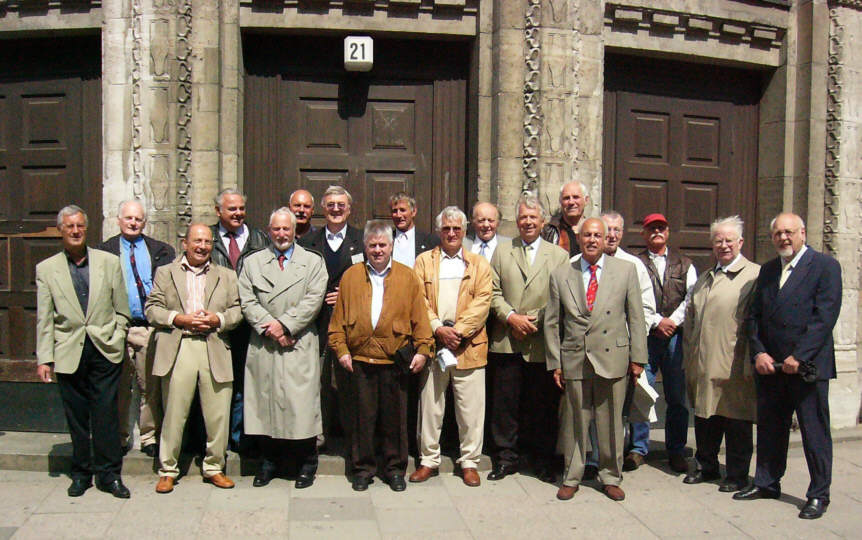 Die Gruppe M6b des Examens-Jahrgangs 1965 fand sich zum Gruppenbild am Tage der mündlichen Examensprüfung am 5.7.1965 zusammen. Dieses Bild - vermutlich aufgenommen von Dipl.-Ing. Peter Suhling, dem einzigen Absolventen dieser Gruppe, der auf dem Bild fehlt - wurde von Dipl.-Ing. Manfred Aust zur Verfügung gestellt, auf dessen Homepage sich u. a. auch das Bild unten findet, das anlässlich eines Treffens der Ehemaligen am 25.1.2003 in Hamburg aufgenommen wurde. |